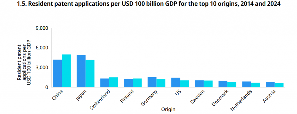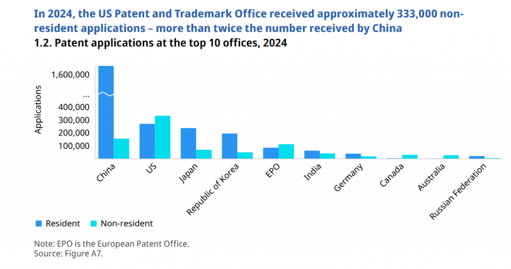 具体而言:2024年,全球共提交了370万件专利申请,主要来自中国、印度、韩国和日本。其中,中华人民共和国国家知识产权局(CNIPA)收到了180万件专利申请——是美国专利商标局(USPTO)的三倍多。