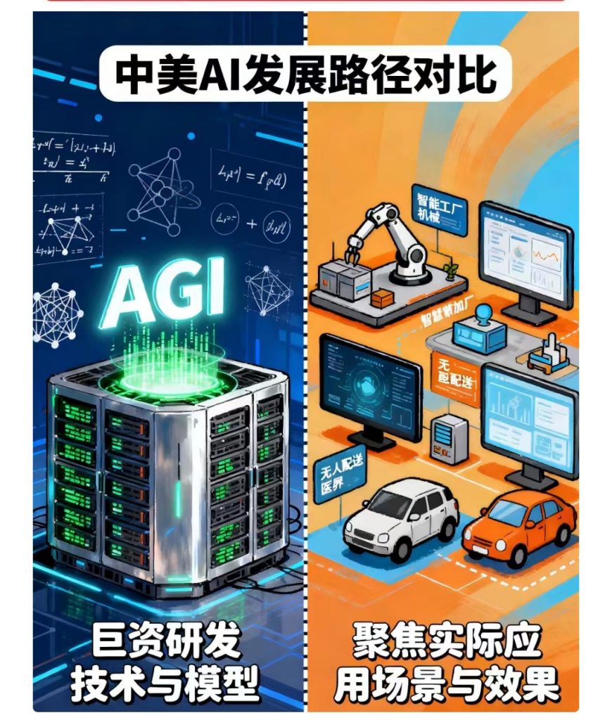 中美两国正走向不同的技术路径。美国业界将通用人工智能(AGI)视为一场聚焦顶尖模型的国家级竞赛,倾注海量资源追求“一个模型解决一切”的超级智能;而在中国,发展重心则更倾向于寻找“最有价值的应用”,关注如何将AI技术融入真实、复杂且规模庞大的经济场景之中,使之成为切实提升生产效率、解决实际问题的核心工具。